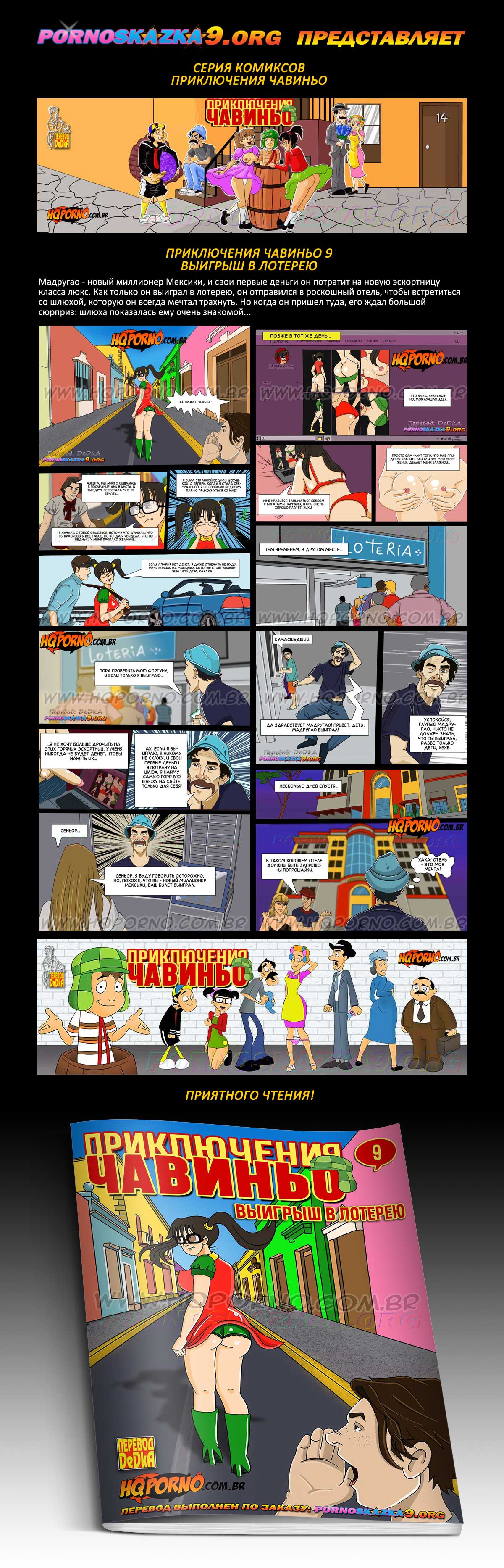 Порно комикс «Приключения Чавиньо. Часть 9. Выигрыш в лотерею.» Мадругао — новый миллионер Мексики, и свои первые деньги он потратит на новую эскортницу класса люкс. Как только он выиграл в лотерею, он отправился в роскошный отель, чтобы встретиться со шлюхой, которую он всегда мечтал трахнуть. Но когда он пришел туда, его ждал большой сюрприз: шлюха показалась ему очень знакомой…